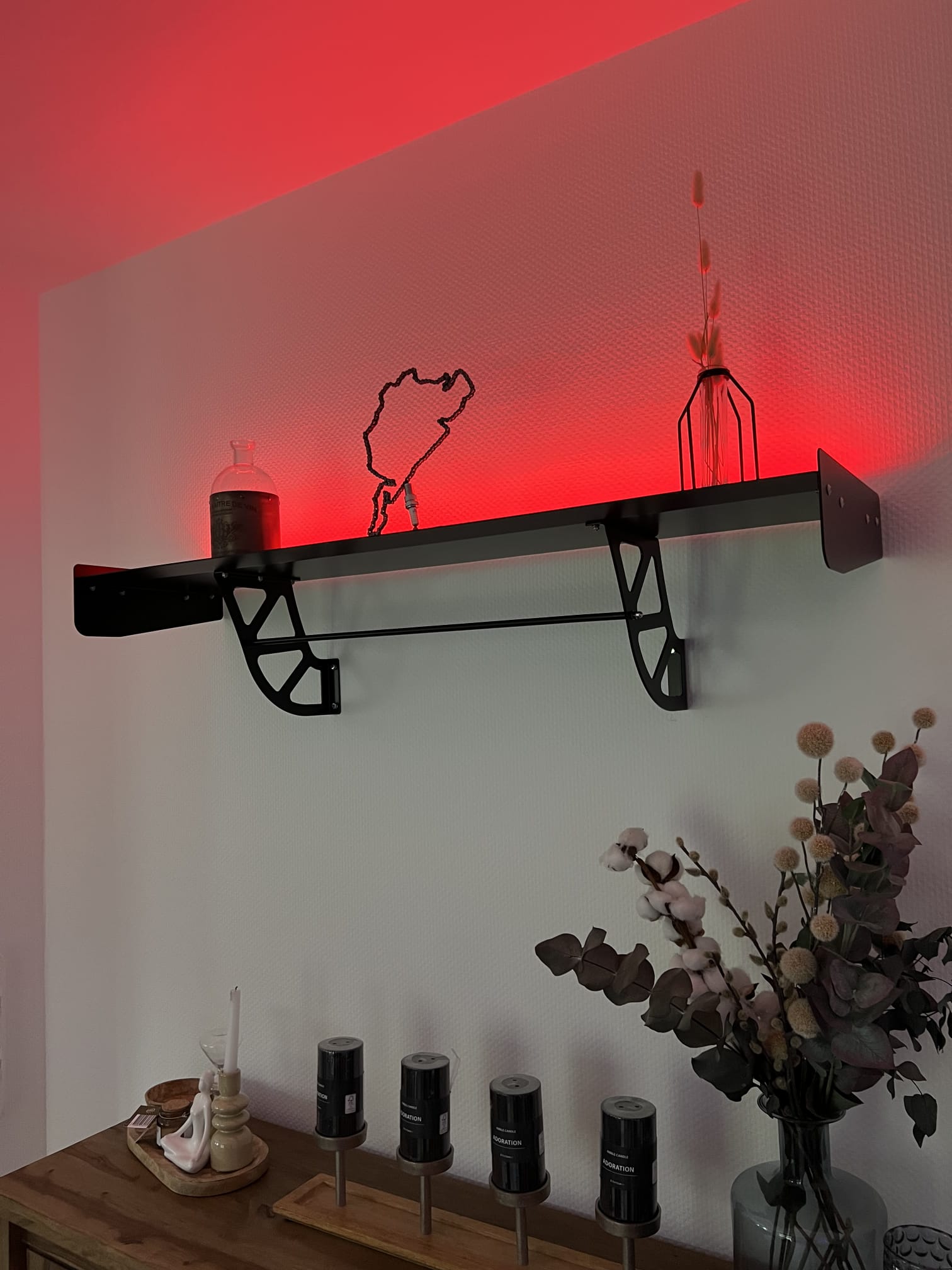 Verleihen Sie Ihrem Raum das gewisse Etwas mit diesem einzigartigen Wandregal im Design eines sportlichen Heckspoilers! Inspiriert von den aerodynamischen Formen eines Sportwagens, kombiniert dieses Regal außergewöhnliche Optik mit funktionaler Robustheit.
