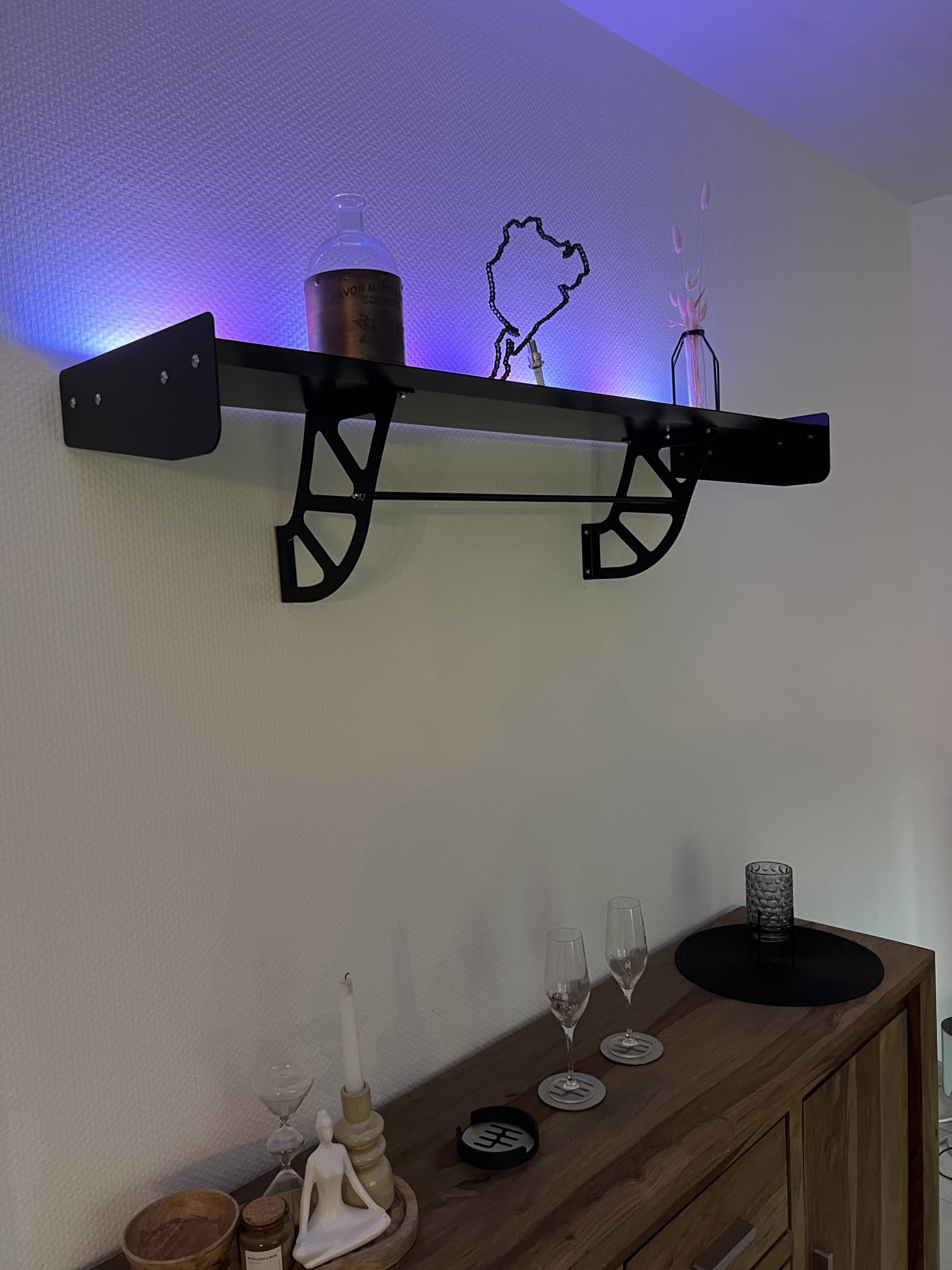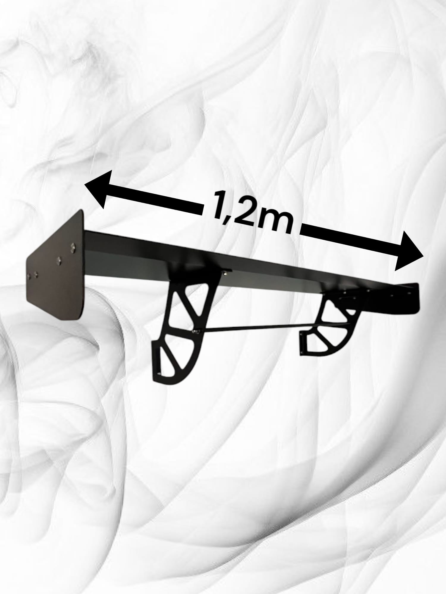 Gefertigt aus hochwertigem Stahl und in elegantem, mattem Schwarz pulverbeschichtet, bietet es nicht nur Stabilität, sondern auch einen modernen, minimalistischen Look, der jedes Zimmer aufwertet. Mit einer Länge von 1200 mm, einer Breite von 330 mm und einer Höhe von 280 mm passt es perfekt in verschiedene Räume, sei es im Wohnzimmer, in der Garage oder im Büro. Das Wandregal ist belastbar bis zu 15 kg und bietet ausreichend Platz für Dekorationsobjekte, Bücher oder auch kleine Sammlerstücke.
